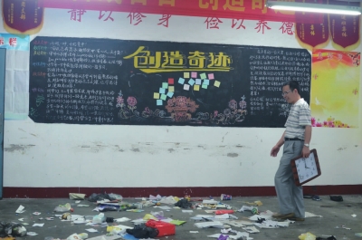 此时的高三(4)班,全部桌椅被腾空,一片狼藉。但日历、巨大的横幅、模拟考的排名、学生们信誓旦旦的宣誓纸条伴随着“创造奇迹”四个大字,一切都在告诉我们,这里曾经发生的一切都是清晰的。或许只有先后经历过9次高考的郑坚中明白,这样的清晰记忆只是暂时的,终将被学生们抛掷脑后。