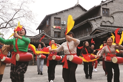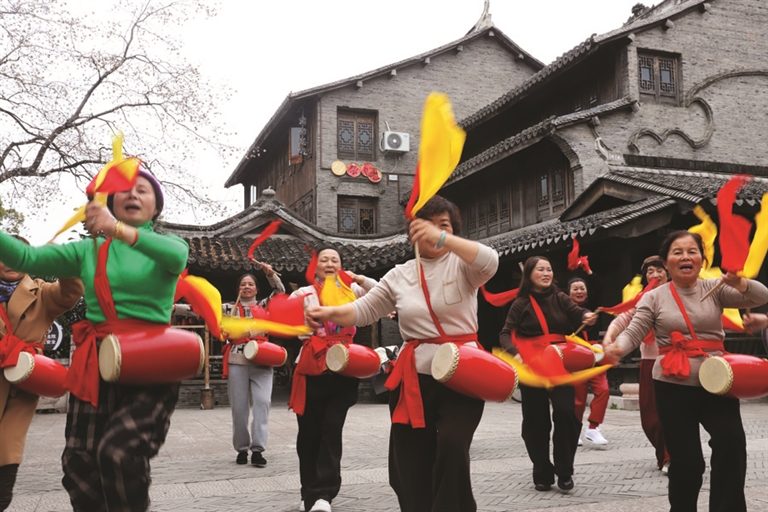 1月24日,路桥街道古街社区,一群老年腰鼓爱好者们,正在欢乐地打腰鼓,赞美新时代的幸福美好生活。